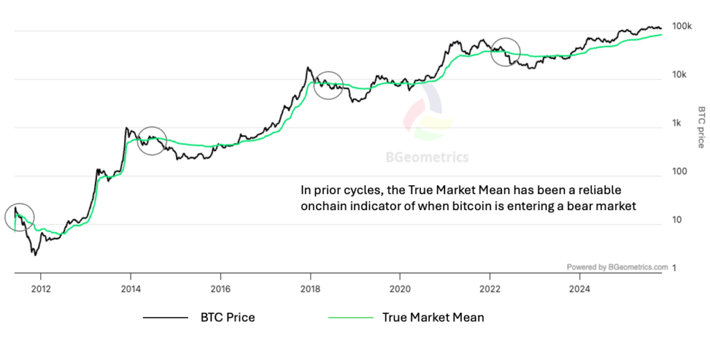To assess the market’s internal fragility, it is essential to evaluate metrics that reflect actual investor cost bases and capital commitment. One such framework is True Market Mean, introduced by David Puell and James Check in their paper Cointime Economics. This metric refines the concept of realized price by isolating the cost basis of actively circulating supply and excluding long-dormant or likely lost coins that do not meaningfully participate in price discovery. The result is a more economically relevant estimate of where engaged capital is positioned.