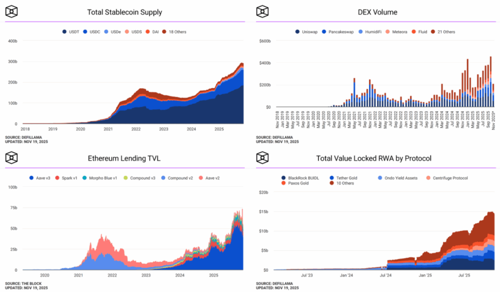 Finally, crypto’s real-economy fundamentals are strengthening in ways not reflected in price. Stablecoins surpassed $300 billion in supply this year, with transaction volume more than doubling. Tether alone is projected to earn $15 billion in profit for 2025. Crypto-native stablecoin platforms like Ethena (disclosure: Blockforce is an investor) have generated over $500 million in revenue so far this year. DeFi platforms are producing meaningful, organic revenue: Hyperliquid (disclosure: Blockforce is an investor) is on track for more than $1 billion in annualized revenue. Tokenization of real-world assets is accelerating as regulatory clarity improves, and early metrics show consistent month-over-month growth in volume and user participation. These indicators tell a very different story than spot price: they point to an ecosystem deepening, scaling, and institutionalizing.