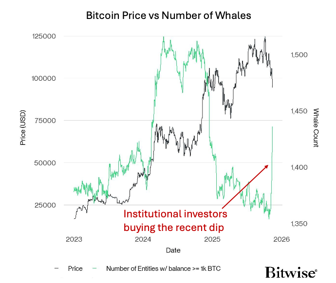 What has changed over the last month is the demand side: macro uncertainty from the tariff announcement temporarily paused institutional accumulation. Even so, the underlying trend is clear. Ownership is rotating from old whales to institutions with multiyear horizons. Data from Glassnode shows that wallets holding more than 1,000 BTC—typically institutional accounts—have spiked to a four-month high. Spot bitcoin ETFs now hold roughly 200,000 more BTC than earlier in the year, even as price has fallen to its lowest level since April. Their average cost basis, around $86,000, underscores the difference between the old and new investor bases. Early holders were sitting on 100x gains; ETF buyers are essentially break even on average and have no incentive to sell until materially higher prices. In effect, a higher structural price floor is forming in the market.